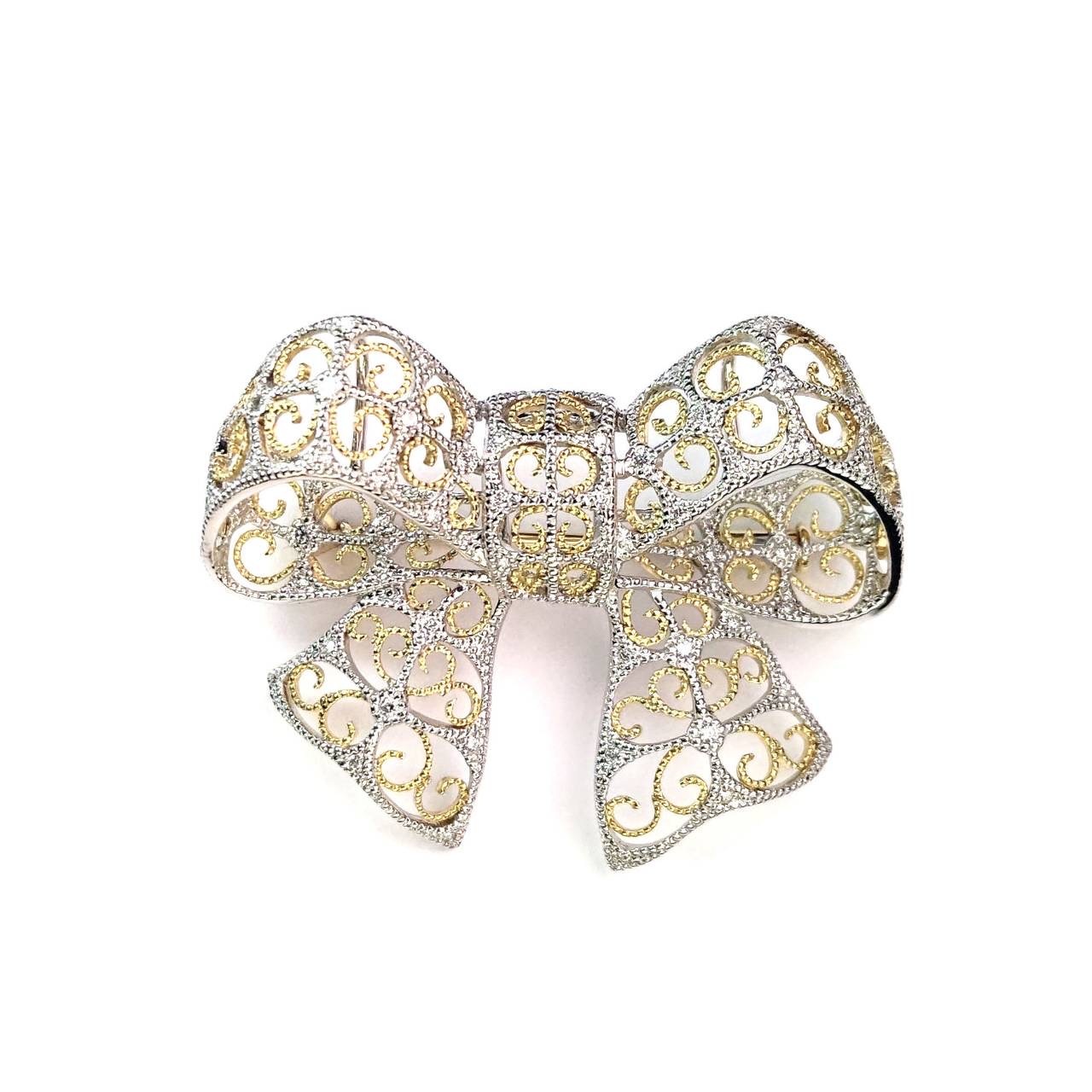 宝石作家が手がけた、リボンモチーフのネックレス兼ブローチは、可愛らしさと品の良さが絶妙に調和した一点ものの作品です。金の線を一本一本、まるで空気を編むように丁寧に形づくる工程には、多くの熟練した職人の手が関わり、時間と技術、そして美意識が惜しみなく注がれています。量産では決して生まれない、手仕事ならではの温度と立体感が宿っています。